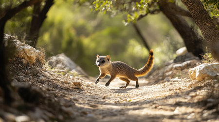 A common mongoose mid-stride on a dirt path in a Mediterranean forest, showcasing its agile movement and keen awareness.