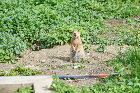 A funny cute gopher stands on his hind legs and stares in wonder at the camera