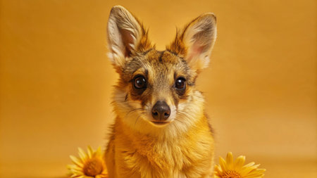 A cute, small fox-like mammal with big ears, brown fur, and dark eyes looks directly at the camera against a yellow background. Two sunflowers are in the foreground.