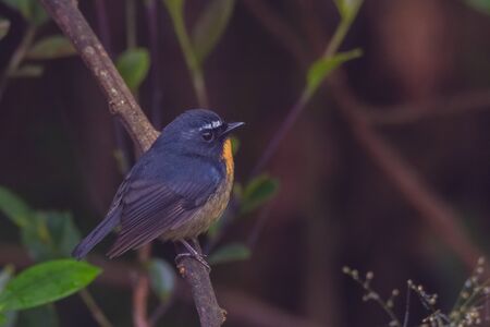 Funny bird look up to sky with wonder face while perching on thin wooden twig, Chinese blue flycatcher (Cyornis glaucicomans)
