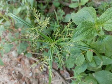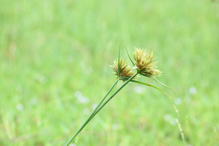 Cyperus rotundus (coco-grass, Java grass, nut grass, purple nut sedge, purple nutsedge, red nut sedge, Khmer kravanh chruk) with natural background. Cyperus rotundus is a perennial plant.