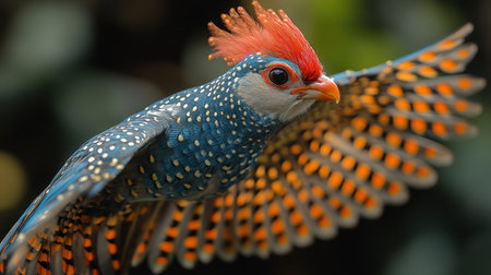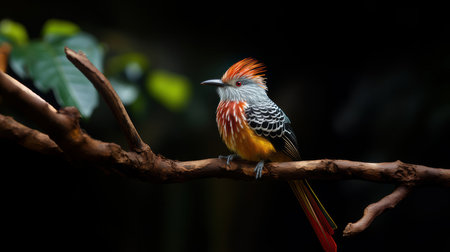 Colorful exotic bird with vibrant red, orange, and yellow feathers perched on a branch in its natural habitat. Striking plumage and captivating detail.