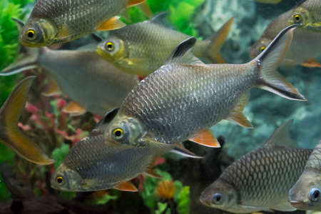 Close-up of a group of fish in the aquarium. Selective focus.