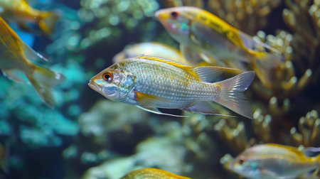 Freshwater cichlid fish swimming together in a domestic aquarium with plants and coral
