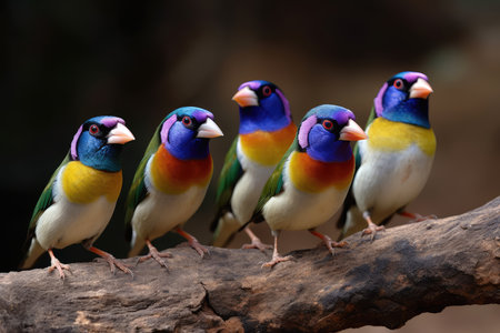 Beautiful birds Guldova Amadina (Erythrura gouldiae) sitting on a close-up branch