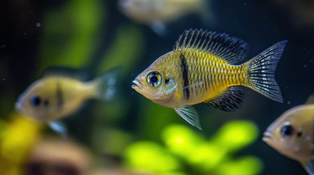 Delight in the beauty of colorful freshwater fish swimming among lush green plants in an aquarium, showcasing vibrant colors and intricate details in a serene underwater scene.