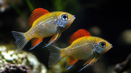 Two lively freshwater fish swim in a captivating underwater scene, showcasing their vibrant colors and delicate fins against a rich aquatic background full of life.