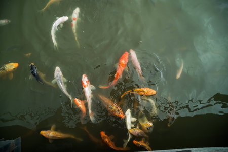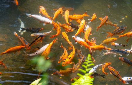 Detail of colorful Koi Fishs or Koi Carp swimming inside the fish pond at sunny day, Japanese fish species, Many colorful patterns, No focus, specifically.
