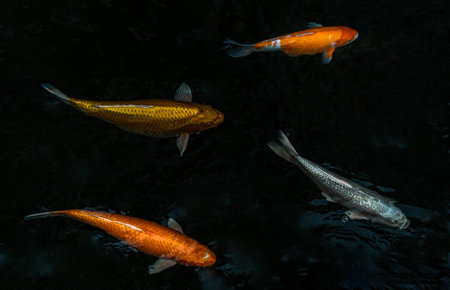 JapJapan koi fish or Fancy Carp swimming in a black pond fish pond. Popular pets for relaxation and feng shui meaning. Popular pets among people. Asians love to raise it for good fortune.an koi fish or Fancy Carp swimming in a black pond fish pond. High quality photo
