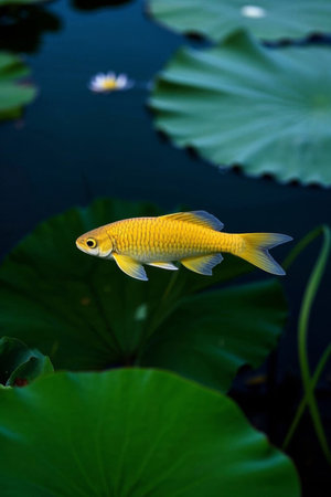 This stunning image captures vibrant goldfish swimming in a tranquil pond. The bright orange colors and gentle ripples create a serene and peaceful aquatic scene.