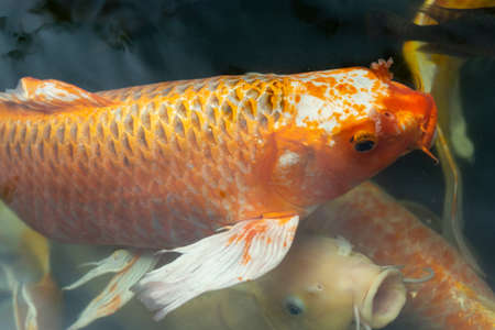 Koi fish, Colorful fancy fish closeup swimming at pond.