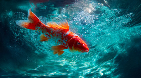 A vibrant koi fish glides through the clear waters of a serene pond, creating soothing ripples and showcasing its stunning colors. Ideal for nature lovers.