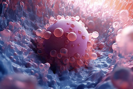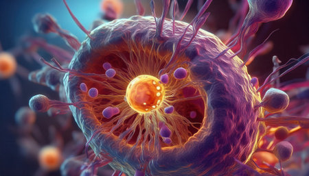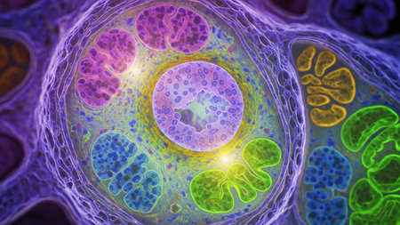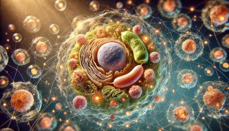Vivid cell illustration showcasing complex structures and processes in a lab setting.