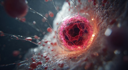 A close-up view of a biological cell, glowing red within its transparent membrane, with surrounding elements