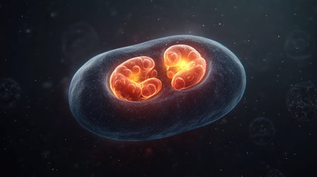 Abstract depiction of a single cell structure with intricate details, vibrant hues of blue, purple, and orange, and glowing effects against a dark background.