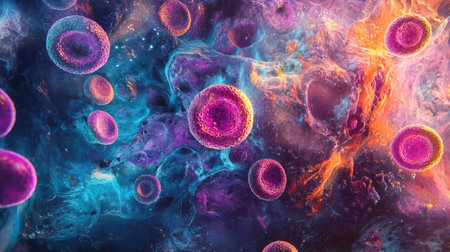 This colorful and vibrant abstract image showcases cellular structures floating in a cosmic space filled with luminous textures, ideal for scientific or artistic use.