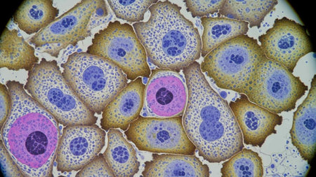 This close-up image depicts cancer cells under laboratory equipment, showcasing intricate details for medical analysis and health research. Ideal for educational use.