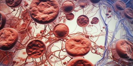 Stunning closeup of vibrant cells floating in a dynamic environment. Perfect for science and health themes, emphasizing exploration and microscopic beauty in biology.