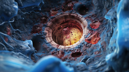 Microscopic red cells flowing through tissue tunnel. Generative AI