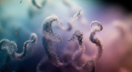 Abstract 3d render of swirling particle strands with a soft focus on a colorful pastel background