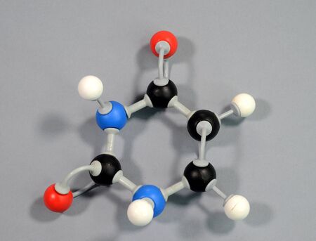 Molecule model of the DNA element Uracil. Black is Carbon, Red is Oxygen, White is Hydrogen, Blue is Nitrogen