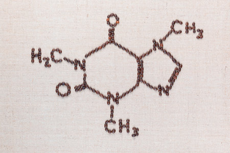 Caffeine chemical formula made from roasted coffee beans on creamy linea canvas, shot top view, aligned in center.