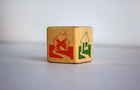 The concept of opposites, wood cube with house signs on beautiful white background, copy space.