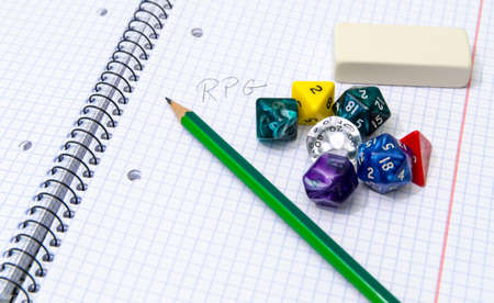 open exercise book with sticky card, pen and role playing dices - stock photo