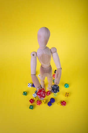Wooden manikin joint doll holding game dice on a yellow background