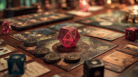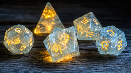 A captivating arrangement of glowing dice and geometric shapes on a dark wood surface, perfect for gaming enthusiasts and artistic displays.