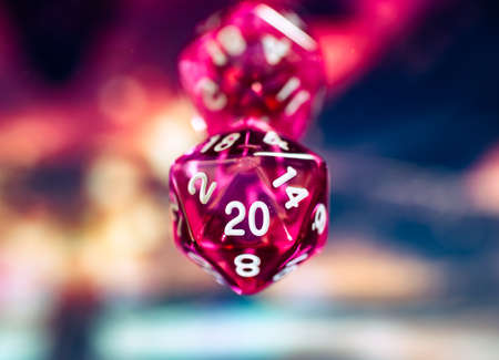 Close up of a transparent pink polyhydral dice againt a blury collorful background. D20