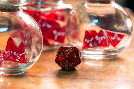 Close-up image of a red 20-sided role-playing gaming die within the background a set of dice and ceramic jar