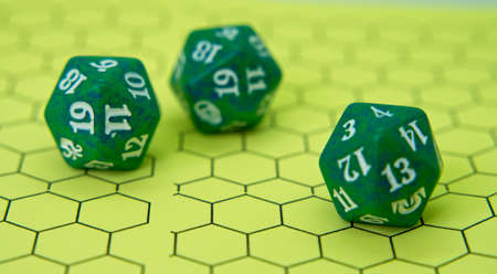 RPG green dice set for playing board games with a spell book on a background. Board games activities.
