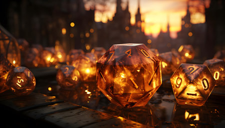 A dramatic close-up of colorful polyhedral dice used in tabletop role-playing games, placed on a reflective surface. The focus is on the vibrant dice in the foreground, while fantasy miniatures of characters and enemies are blurred in the background, creating a moody and immersive atmosphere.