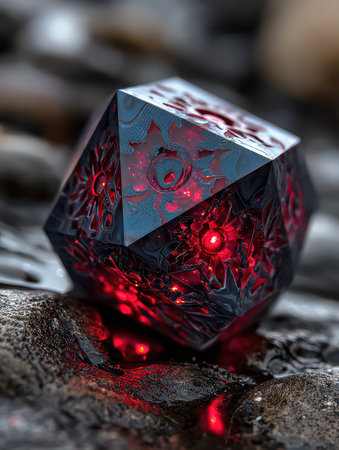 Image of a crystal red ball reflecting rpg dice with in the background a journal and quill in cool light.