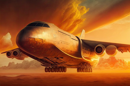 futuristic cargo plane of future flying through orange sunset sky, created with generative ai