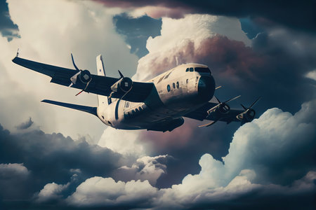 cargo plane flying through the clouds, with a second cloudy sky in the background, created with generative ai