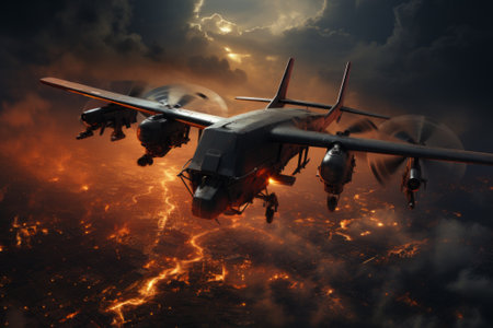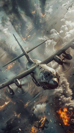 A military aircraft amidst explosive dogfight with clouds & fiery blasts. Generate AI