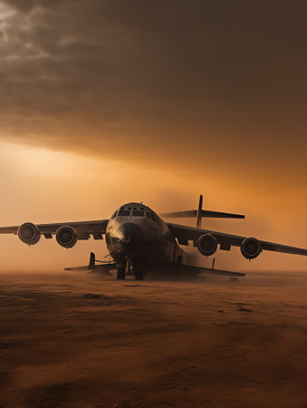 Turbulent Takeoff: Military Aircraft in Sandstorm. Generative ai. High quality illustration