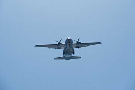 Two-engine airplane in the blue sky. Turboprop transport aircraft