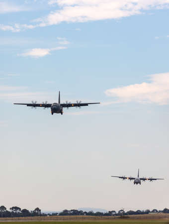 Avalon, Australia - February 27, 2015: Two Royal Australian Air Force Lockheed Martin C-130J Hercules military cargo aircraft performing a tactical approach to Avalon Airport.