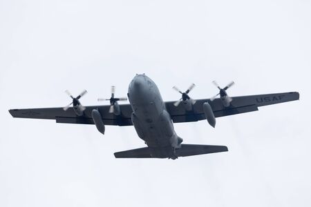 Louisville, Kentucky, USA - April 13, 2019: Thunder Over Louisville, United States Air Force C-130H Performing a fly by during a parachute cargo drop into the Ohio River