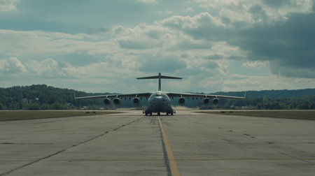A majestic military cargo aircraft stands prominently on the runway, poised for takeoff against a backdrop of rolling mountains and a moody sky.
