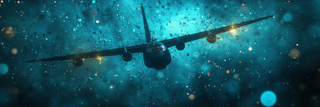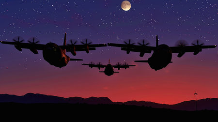 Cinematic military cargo aircraft flying at night with bright flares and dramatic lighting, tactical aviation and defense mission concept.
