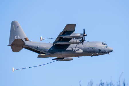 Feb 29, 2020 Mountain View / VA / USA - Lockheed Martin HC-130J Hercules military aircraft performing air refueling exercises near Moffett Federal Airfield in South San Francisco Bay Area