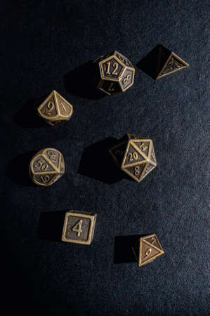 Vertical image of a set of bronze metal role-playing game dice on a black surface