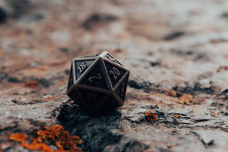 Close-up image of one 20-sided metallic role-playing die on a rough rock surface with orange lichen