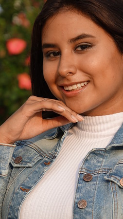 A woman stands outside, displaying a bright smile and natural beauty. She wears a colorful dress, surrounded by greenery in a cheerful atmosphere, representing joy and warmth.