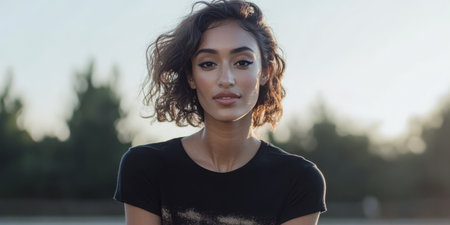 A woman with curly hair stands confidently outdoors during sunset wearing a casual black shirt. The soft light enhances her features against a blurred nature background.