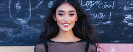 A young woman stands confidently with a bright smile, wearing a black sweater and earrings. She poses against a gray wall, creating a striking contrast.